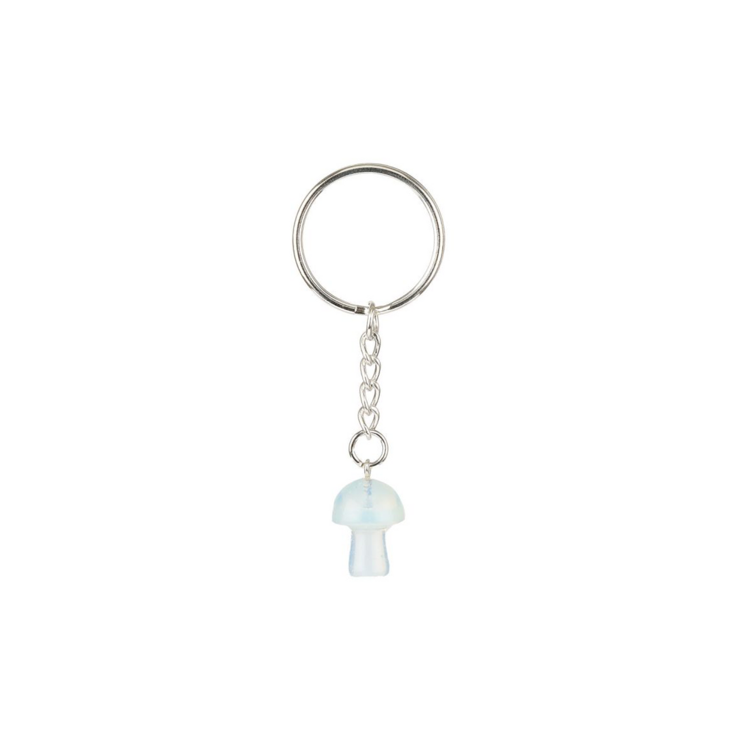 This keyring features a smooth, mushroom-shaped charm carved from opalite, a man-made glass known for its glowing, iridescent appearance that shifts between soft blues and milky whites. Opalite is admired for its dreamy, ethereal look and smooth finish.