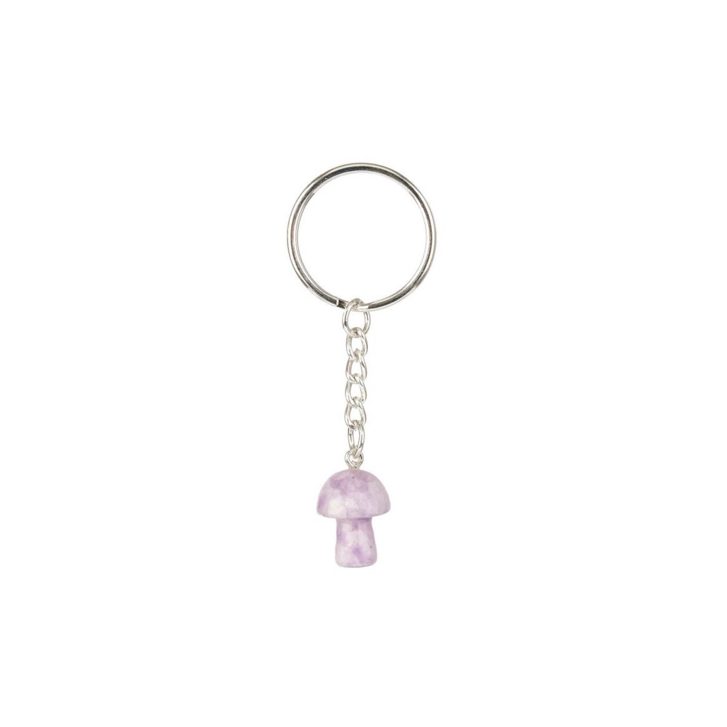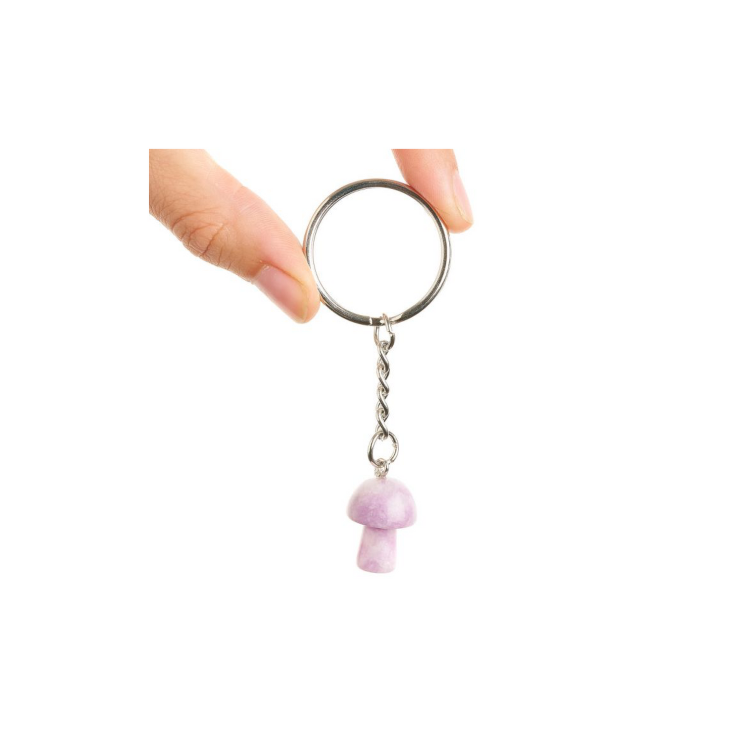 A lepidolite mushroom keyring is a small mushroom-shaped charm made from lepidolite, a soft purple stone that symbolises peace, balance, and transition.Its gentle shimmer and compact size make it a charming addition to any set of keys or bag.