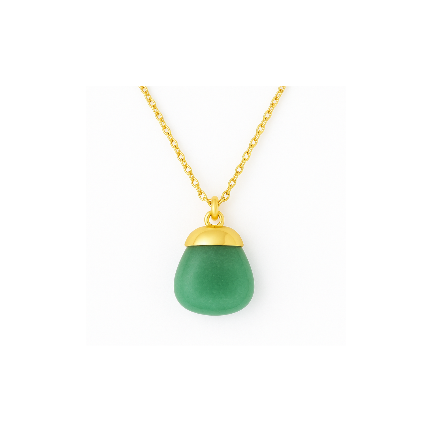Polished green aventurine tumble stone pendant, finished with a gleaming gold-plated cap and suspended from a fine gold-plated chain. The stone’s fresh green hue and subtle shimmer make each piece naturally distinctive. The lively color of green aventurine pairs beautifully with the warm glow of gold, creating a necklace that is both elegant and versatile—ideal for bringing a touch of nature-inspired charm to any look.