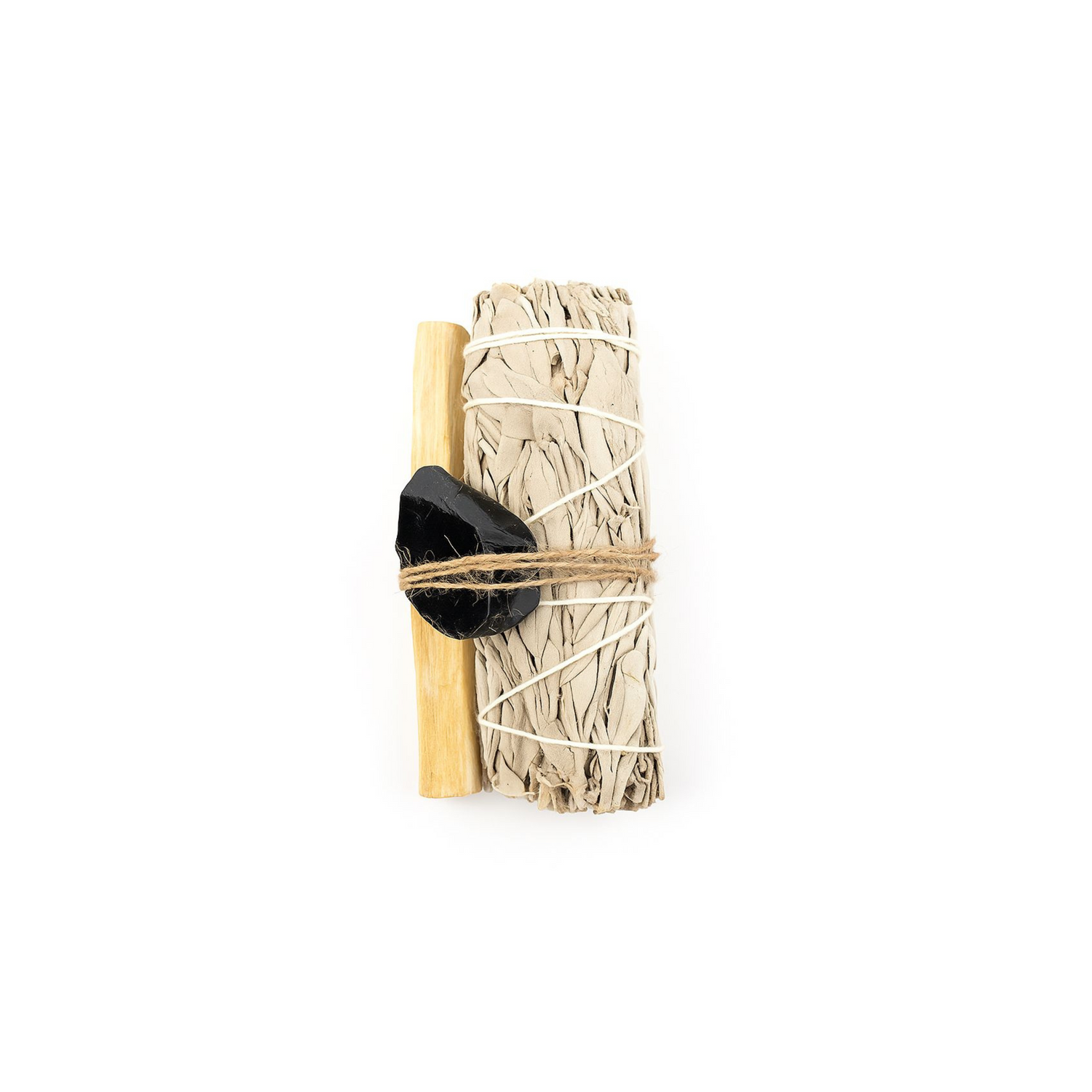 This set includes a white sage bundle, a palo santo stick, and a raw obsidian crystal, all tied together with natural jute string. The sage and palo santo offer rich, earthy aromas when lit, enhancing the atmosphere of any space. The obsidian, a naturally formed volcanic glass, symbolizes strength and clarity adding a bold visual element with meaning and presence.