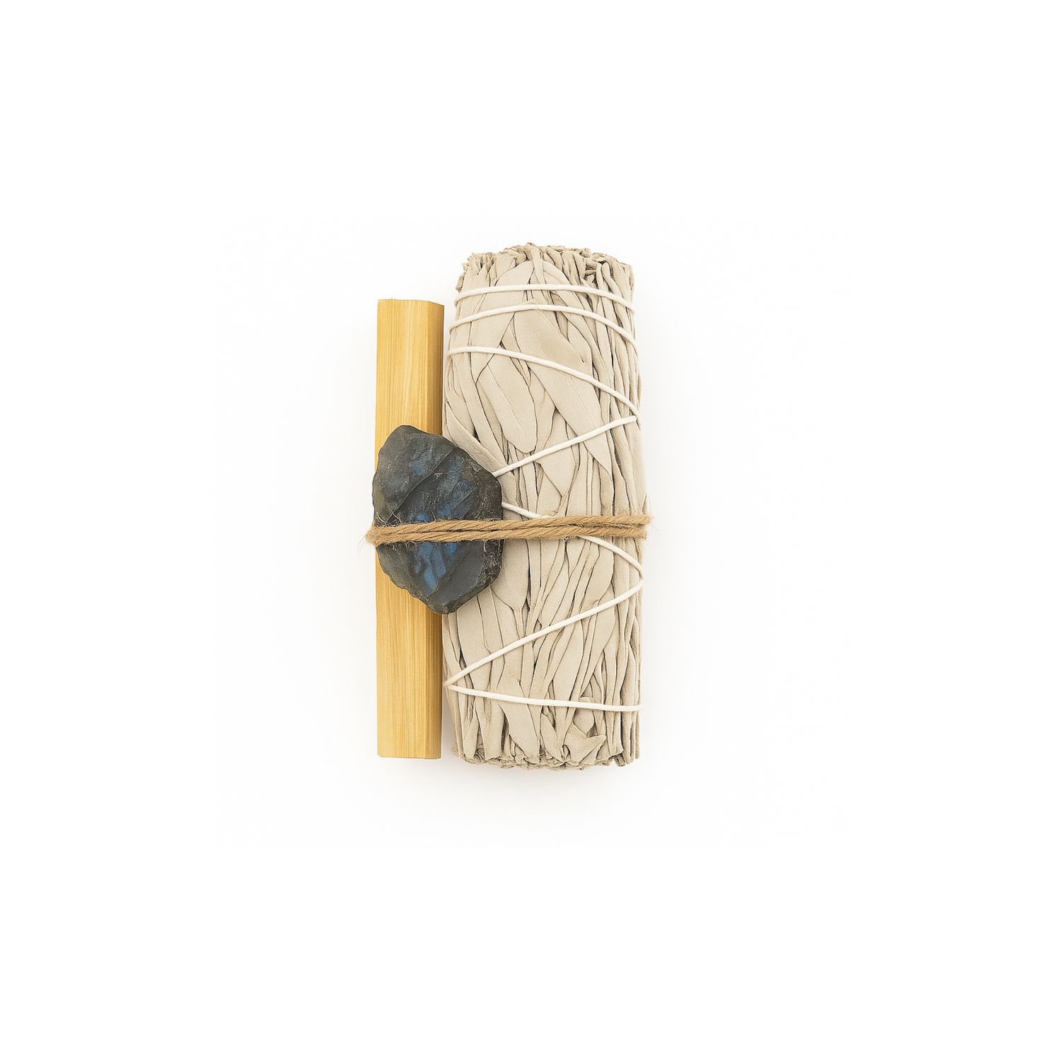 This elegant smudge set includes a white sage bundle, a palo santo stick, and a raw labradorite stone, all tied with natural jute string. The sage and palo santo offer rich, grounding aromas when gently burned. Labradorite, known for its dark, iridescent sheen with flashes of blue and green, symbolizes transformation and insight bringing a striking, reflective quality to this earthy, handcrafted set.