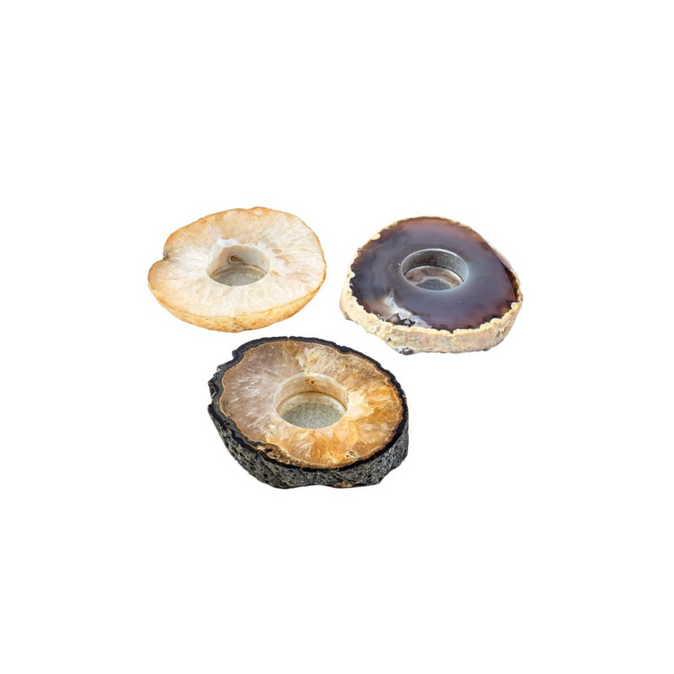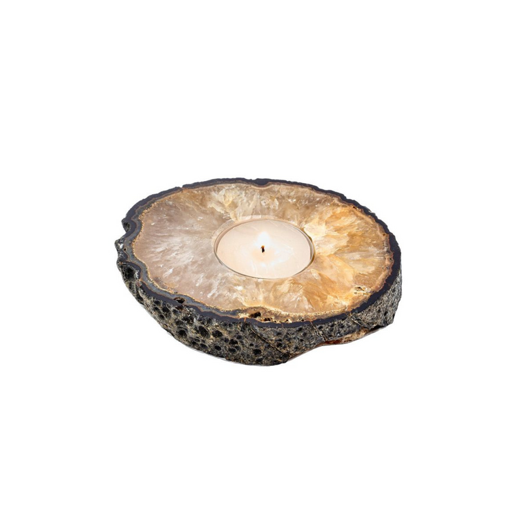 Our Agate Slab Tealight Holder Natural features a polished agate slab with a space to hold a tealight candle. Known for its vibrant colors and natural banding, agate symbolizes strength, balance, and protection. This piece adds a unique, earthy touch to any setting while offering a warm glow from the candle.